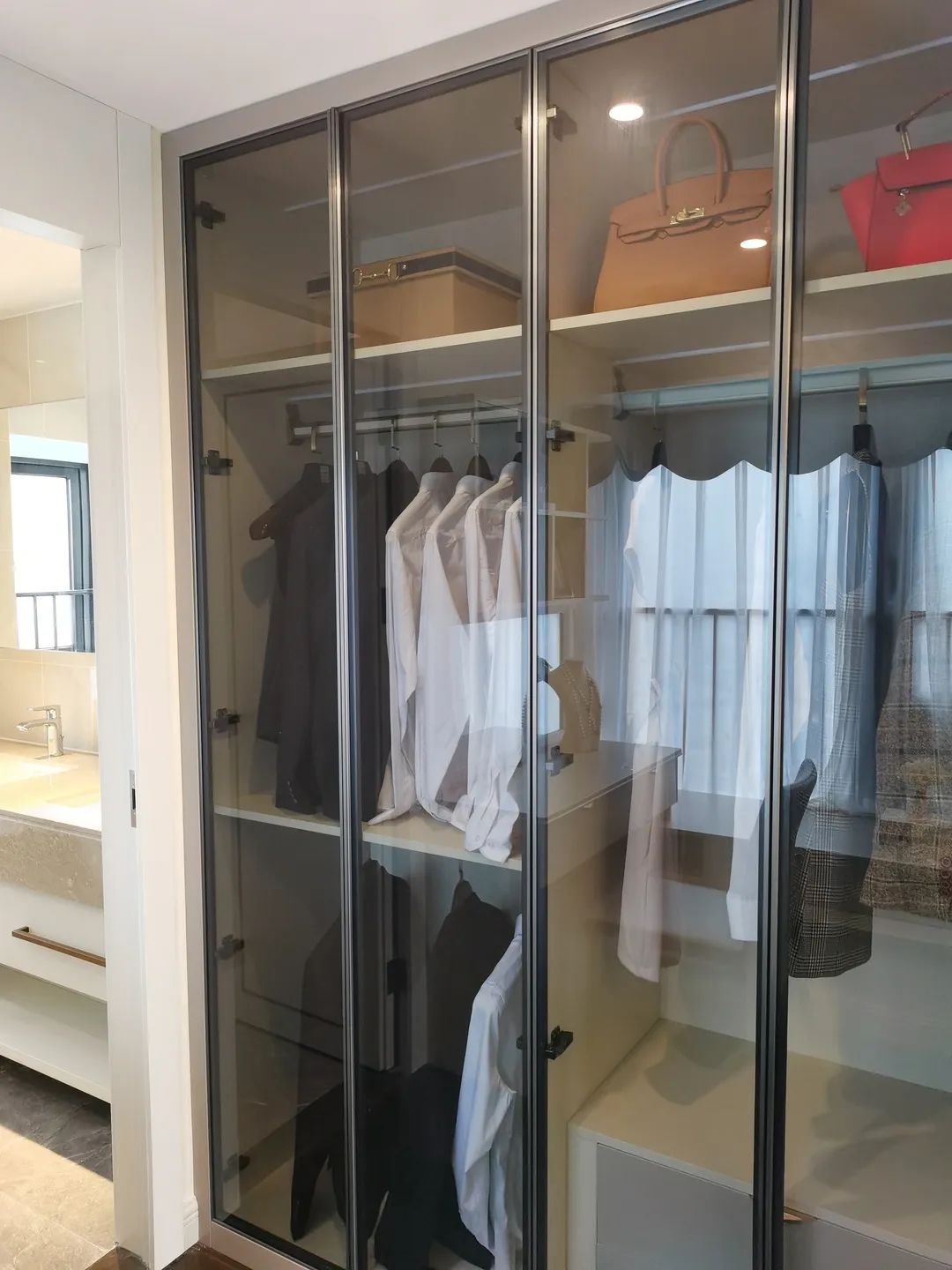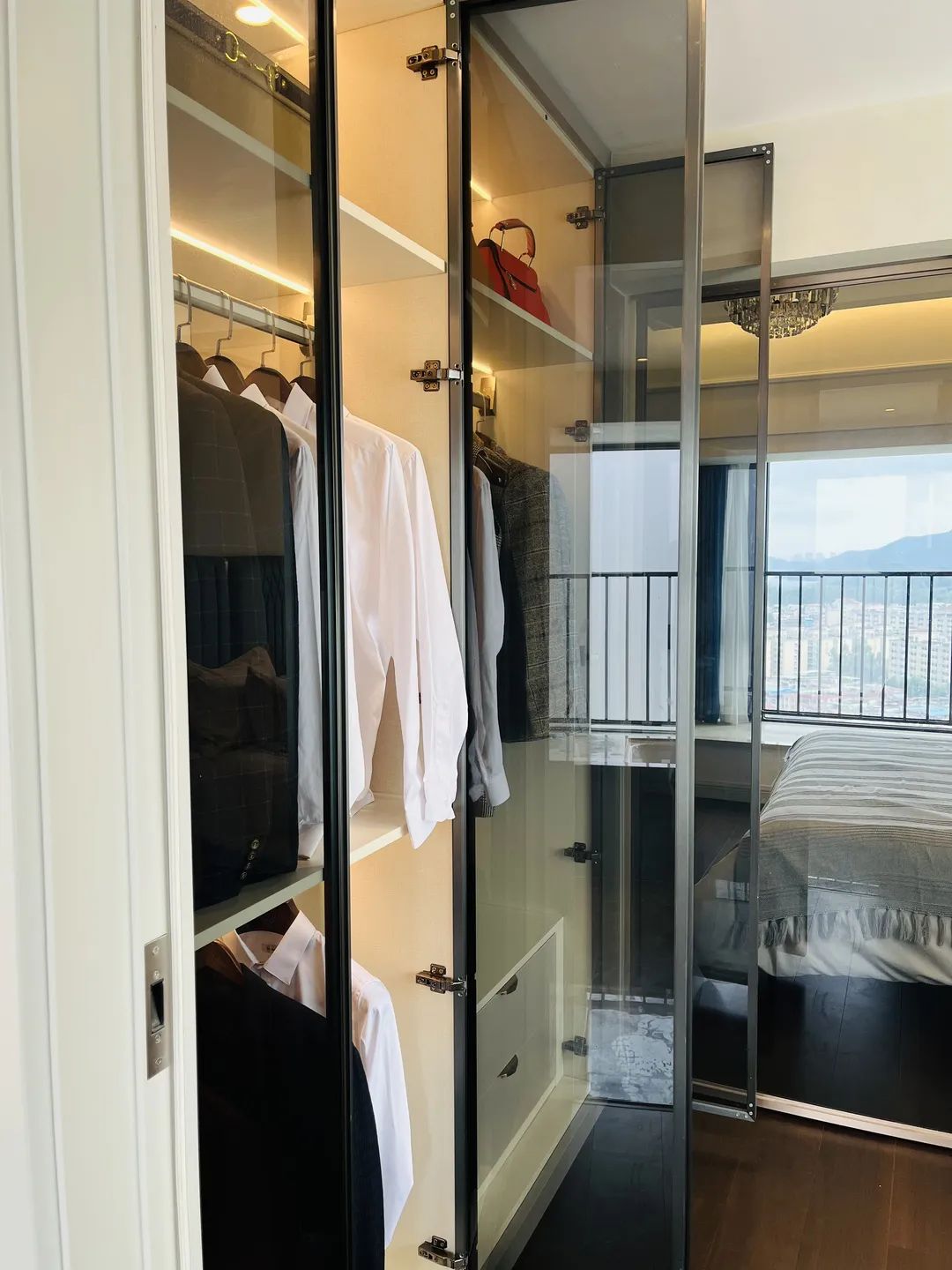 主卧睡眠空间与衣帽间相隔半扇透玻璃门,